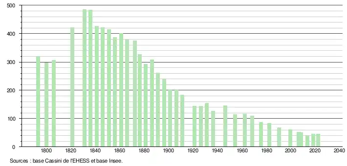 L'évolution du nombre d'habitants est connue à travers les recensements de la population effectués dans la commune depuis 1793. Pour les communes de moins de 10 000 habitants, une enquête de recensement portant sur toute la population est réalisée tous les cinq ans, les populations de référence des années intermédiaires étant quant à elles estimées par interpolation ou extrapolation[15]. Pour la commune, le premier recensement exhaustif entrant dans le cadre du nouveau dispositif a été réalisé en 2008[16].