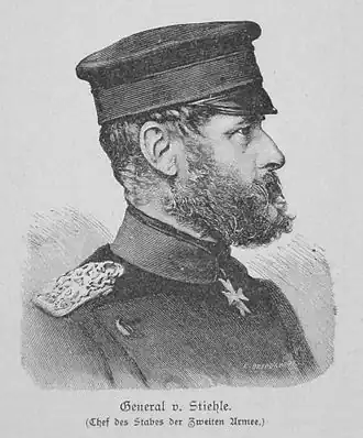 Avec la mobilisation pour la guerre contre la France, Stiehle devient chef d'état-major général du 2e armée et peu de temps après le il est promu major général. Pendant les combats il prend part aux batailles de Saint-Privat, Beaune-la-Rolande, Orléans et Le Mans, ainsi qu'au siège de Metz. Avec le général français Hugues-Louis Jarras (1811-1890) il achève la capitulation de Metz. Il a pu se distinguer plusieurs fois pendant la guerre et reçoit notamment le la Croix de fer de 1re classe et le les feuilles de chêne pour le Pour le Mérite.