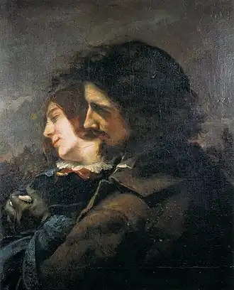 Les années 1840 voient aussi éclore le premier grand amour de Courbet en la personne de Virginie Binet (1808-1865), sur laquelle l'on dispose de peu d'informations. Leur relation semble avoir duré une dizaine d'années et s'être très mal terminée. Liaison redécouverte tardivement, et selon les historiens d'art Jack Lindsay[33] et Hélène Toussaint[34], Virginie aurait été embauchée comme modèle par Courbet, posant rue de la Harpe. On voit dans Les Amants ou Valse (1845, présenté au Salon de 1846, refusé) une représentation de leur relation devenue amoureuse. La morale du temps interdit à Courbet d'en parler dans sa correspondance familiale, surtout qu'il est encore aidé par ses parents : le peintre reste donc évasif sur ces tableaux-là. D'autre part, en septembre 1847, Virginie donne naissance à Désiré Alfred Émile, qu'elle doit déclarer « enfant naturel ». Il est avéré que jamais Courbet ne le reconnaîtra de façon officielle — l'enfant est mort en 1872 sous le nom de sa mère à Dieppe, ville où Virginie s'était installée après la rupture avec Courbet au début des années 1850[24]. Un autre fait troublant est ce que révèle la radiographie d'une toile intitulée L'Homme blessé : jamais exposée du vivant du peintre, on y distingue deux repentirs dont l'un montre un jeune couple tendrement enlacé où les experts voient Virginie et Gustave, le tableau présentant en définitive l'image d'un homme agonisant[35].