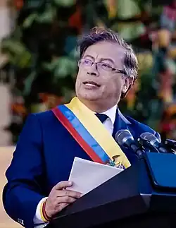 Le , Gustavo Petro est investi président de la république de Colombie[30]. Alors que la journée coïncide avec l’anniversaire de la célèbre bataille de Boyacá (7 août 1819) qui conduisit à l’indépendance de la Grande Colombie vis-à-vis de l'empire espagnol, Gustavo Petro demande que l'épée de Simón Bolívar soit exposée lors de la cérémonie d'investiture place Bolívar, ce qui conduit à plusieurs polémiques. Le président sortant Iván Duque s'oppose d'abord à ce qu'elle y soit amenée, générant un retard. Puis, alors que toutes les personnes présentes se lèvent au passage de l'épée, seul le roi d'Espagne Felipe VI reste ostensiblement assis[31],[32].