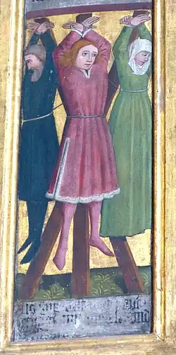L'un des supplices de Guy dans un chaudron rempli de poix bouillante, détail de la prédelle de l'autel de l'église Saint-Guy à Flein. | |