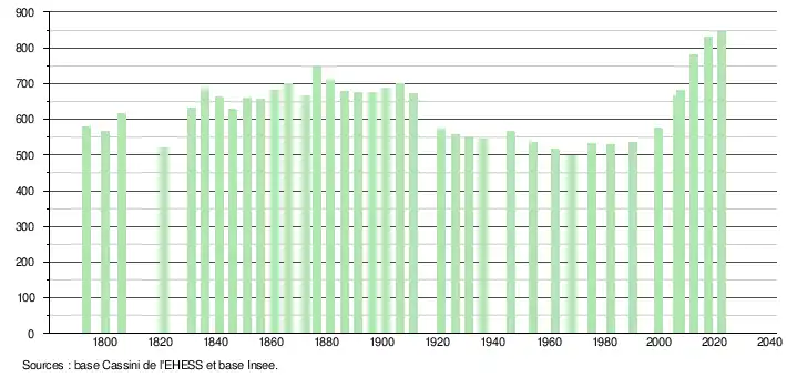 L'évolution du nombre d'habitants est connue à travers les recensements de la population effectués dans la commune depuis 1793. Pour les communes de moins de 10 000 habitants, une enquête de recensement portant sur toute la population est réalisée tous les cinq ans, les populations de référence des années intermédiaires étant quant à elles estimées par interpolation ou extrapolation[19]. Pour la commune, le premier recensement exhaustif entrant dans le cadre du nouveau dispositif a été réalisé en 2007[20].