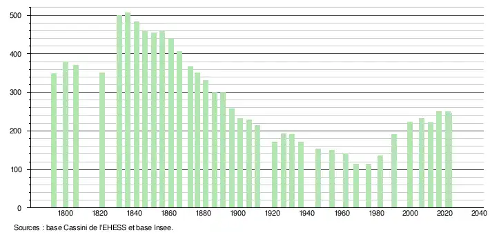 L'évolution du nombre d'habitants est connue à travers les recensements de la population effectués dans la commune depuis 1793. Pour les communes de moins de 10 000 habitants, une enquête de recensement portant sur toute la population est réalisée tous les cinq ans, les populations de référence des années intermédiaires étant quant à elles estimées par interpolation ou extrapolation[25]. Pour la commune, le premier recensement exhaustif entrant dans le cadre du nouveau dispositif a été réalisé en 2006[26].