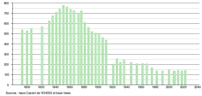 L'évolution du nombre d'habitants est connue à travers les recensements de la population effectués dans la commune depuis 1793. Pour les communes de moins de 10 000 habitants, une enquête de recensement portant sur toute la population est réalisée tous les cinq ans, les populations de référence des années intermédiaires étant quant à elles estimées par interpolation ou extrapolation[28]. Pour la commune, le premier recensement exhaustif entrant dans le cadre du nouveau dispositif a été réalisé en 2007[29].
