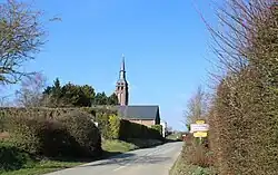 L'entrée du village avec la silhouette élancée de l'église. | |||||