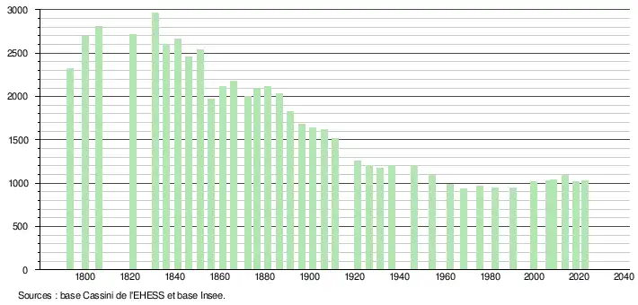 L'évolution du nombre d'habitants est connue à travers les recensements de la population effectués dans la commune depuis 1793. Pour les communes de moins de 10 000 habitants, une enquête de recensement portant sur toute la population est réalisée tous les cinq ans, les populations de référence des années intermédiaires étant quant à elles estimées par interpolation ou extrapolation[32]. Pour la commune, le premier recensement exhaustif entrant dans le cadre du nouveau dispositif a été réalisé en 2008[33].
