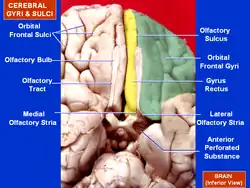 La face inférieure ou orbitaire du lobe frontal est concave, et elle se situe sur la partie orbitaire de l'os frontal. Elle est divisée en quatre gyri orbitaires par un sillon orbitaire en forme de H très marqué. Ceux-ci sont nommés à partir de leur position, les gyri orbitaires médial, antérieur, latéral, et postérieur (en latin : gyri orbitales). Le gyrus orbitaire médial présente un sillon antéro-postérieur très marqué, c'est le sillon olfactif pour le tractus olfactif ; la partie qui se trouve médialement à ceci est appelée le gyrus rectus et il est en continuité avec le gyrus frontal supérieur sur la face médiale[1].
