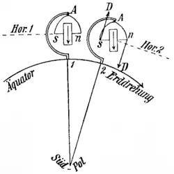 Le schéma de la figure 2, vu du pôle sud, montre un gyroscope se déplaçant le long de l'équateur. Au départ, son axe de rotation s-n est parallèle à la surface de la Terre. Selon la conservation du moment cinétique, l'axe conserve sa direction même lorsqu'il se déplace vers la deuxième position indiquée. Mais à cause de la suspension spéciale, le gyroscope ne peut tourner librement que suivant la verticale. La force de gravité tend à incliner l'axe le long des flèches marquées D. Le couple généré par celui-ci fait basculer l’axe de rotation hors du plan du dessin et fait précéder le gyroscope. En amortissant le mouvement de rotation autour du point A, le gyroscope finit par s’immobiliser lorsque le couple devient nul, c'est-à-dire lorsque l'axe du gyroscope pointe dans la direction nord-sud.