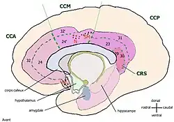 - le cortex cingulaire postérieur CCP, qui consiste dans les aires de Brodman 29, 30, 23, et 31, assure des fonctions « évaluatives ». Parfois la région retrospleniale formée des aires 29 et 30 est considérée à part.