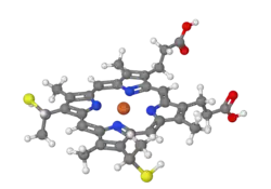 Il est caractérisé par le remplacement de deux chaînes latérales vinyle de l'hème b par deux liaisons thioester vers l'apoprotéine. Il est donc lié plus étroitement à la protéine que l'hème b, qui est lié à la protéine par liaison covalente de coordination avec l'ion ferreux et est ainsi plus facilement dissocié.