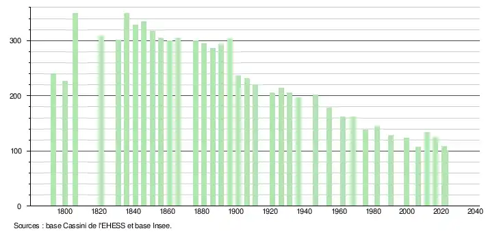 | L'évolution du nombre d'habitants est connue à travers les recensements de la population effectués dans la commune depuis 1793. Pour les communes de moins de 10 000 habitants, une enquête de recensement portant sur toute la population est réalisée tous les cinq ans, les populations de référence des années intermédiaires étant quant à elles estimées par interpolation ou extrapolation[27]. Pour la commune, le premier recensement exhaustif entrant dans le cadre du nouveau dispositif a été réalisé en 2006[28]. En 2022, la commune comptait 101 habitants[Note 6], en évolution de −19,2 % par rapport à 2016 (Hautes-Pyrénées : +1,59 %, France hors Mayotte : +2,11 %). |