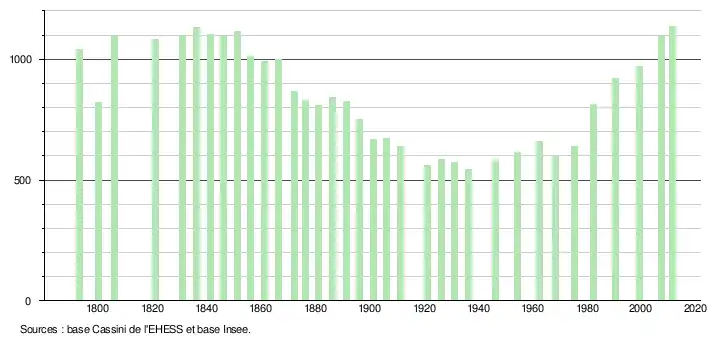 - ↑ Dans le tableau des recensements et le graphique, par convention dans Wikipédia, le principe a été retenu, pour les populations légales postérieures à 1999 de n’afficher dans le tableau des recensements et le graphique que les populations correspondant à l'année 2006, première population légale publiée calculée conformément aux concepts définis dans le décret no 2003-485 du 5 juin 2003, et les années correspondant à une enquête exhaustive de recensement pour les communes de moins de 10 000 habitants, ainsi que la dernière population légale publiée par l’Insee.