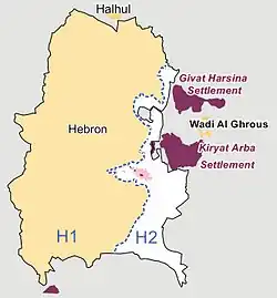 À partir de 1997, le Protocole d'Hébron s'applique[36]. Bien que l'unité de la ville soit réaffirmée[37] la ville est divisée en deux zones pour définir qui intervient sur les questions de sécurité : H1, sous contrôle administratif palestinien recouvre l'essentiel de la ville et où vivent alors 100 000 Palestiniens, et H2, sous contrôle de l'Armée de défense d'Israël, avec interventions de patrouilles conjointes, représente la bordure orientale de la cité (où vivent environ 30 000 Palestiniens) qui comprend des colonies de peuplement juif de 600 à 800 colons près du centre-ville, sous souveraineté israélienne, protégés par près de 2 000 militaires israéliens[20]. Les pouvoirs et responsabilités civils sont dévolus aux Palestiniens, « à l’exception de ceux qui concernent les Israéliens et leurs biens, et qui continueront à être exercés par le Gouvernement Militaire israélien ».