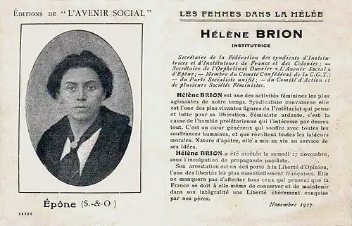 En 1911, Hélène Brion est titularisée à l'école maternelle de la rue Candale à Pantin[1]. En 1912, elle est élue au Conseil fédéral du Syndicat des instituteurs, dont elle devient la secrétaire adjointe en 1914. La guerre et la mobilisation réduisant la taille du bureau, Hélène Brion en devient secrétaire générale par intérim. Elle entre également au comité confédéral de la CGT. En 1915, un fort courant pacifiste nait au sein de la CGT, courant dont Hélène Brion devient la porte-parole. Elle adhère à la section française du Comité international des femmes pour la paix permanente[2], présidée par Gabrielle Duchêne. Empêchée par la police française, elle ne peut pas se rendre à la conférence pacifiste de 1915 à Zimmerwald, ni à celle de Kiental, mais elle correspond par lettres sur ce sujet. Celles-ci, interceptées par la police, serviront au dossier d'accusation monté contre elle à la fin de la guerre. Elle publie aussi des manifestes pacifistes et envoie le une lettre au Comité pour la reprise des relations internationales, comité pacifiste dirigé par Alphonse Merrheim, dont elle est membre.
