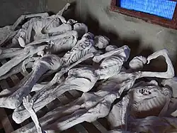 Corps exhumés et momifiés exposés au Mémorial de l’ETO de Murambi. Mi-avril, hommes, femmes et enfants Tutsi sont massacrés (entre 27 000 et 50 000 victimes selon les estimations par rapport aux charniers[42],[43]). Le lieu est également le siège de l'Opération Turquoise entre juin et août[44].