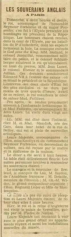 Édouard VII depuis son avènement, conserve un cercle d'amis restreint et qu'il voit régulièrement lors de ses visites à Paris. Ceux qu'il réunit autour de sa table en ces occasions, sont bien sûr Henry et Hélène Standish, mais aussi le marquis Alfred du Lau d'Allemans, le marquis et la marquise de Ganay, le marquis et général Gaston de Galliffet, M. Édouard Detaille, le grand peintre dont le roi ne manque jamais de visiter son atelier, la marquise et le marquis Henry Le Tonnelier de Breteuil, promoteur de l'Entente cordiale[59].