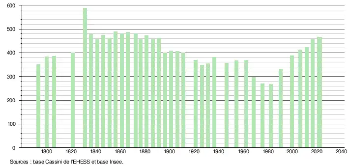 L'évolution du nombre d'habitants est connue à travers les recensements de la population effectués dans la commune depuis 1793. Pour les communes de moins de 10 000 habitants, une enquête de recensement portant sur toute la population est réalisée tous les cinq ans, les populations de référence des années intermédiaires étant quant à elles estimées par interpolation ou extrapolation[29]. Pour la commune, le premier recensement exhaustif entrant dans le cadre du nouveau dispositif a été réalisé en 2006[30].