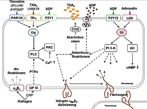 - Adhésion des plaquettes au sous-endothélium grâce à un récepteur membranaire (la glycoprotéine GPIb) par l’intermédiaire du facteur Willebrand. Ce phénomène est très rapide et provoque l’activation des plaquettes.