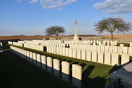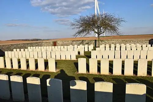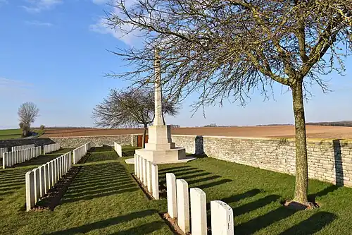 Après l'armistice, des sépultures sont apportées de cimetières provisoires des environs. Le cimetière contient maintenant 307 sépultures du Commonwealth de la Première Guerre mondiale, dont 104 non identifiées[1].