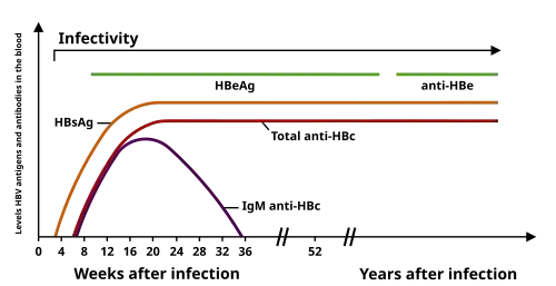 Sur le plan de la sérologie, la première phase, multiplication intense du VHB, est caractérisée par la présence des marqueurs de réplication virale dans le sérum, à savoir ADN du virus et antigène HBe. Cette phase dure de une à plusieurs années.