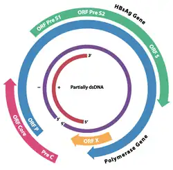 Le génome du virus de l'hépatite B est fait d’ADN circulaire, mais il est inhabituel parce que l'ADN n'est pas totalement bicaténaire. Une extrémité est liée à l’ADN polymérase du virus. Le génome est composé de 3 020 à 3 320 nucléotides (pour le brin le plus long) et de 1 700 à 2 800 nucléotides (pour le brin le plus court)[10]. La partie enroulée en sens négatif, (non codante), est complémentaire de l'ARNm viral. L'ADN viral est retrouvé dans le noyau peu de temps après l'infection de la cellule. La partie d'ADN double brin est rendue totalement bicaténaire par l'appariement du brin (+) et l'élimination d'une molécule de protéine du brin (-) et d’une courte séquence d'ARN à partir du brin (+).Les bases non codantes se retirent de l’extrémité du brin (-) et les brins sont appariés. Il existe quatre gènes codants connus dans le génome, ils sont appelés C, X, P et S. La protéine du core est codée par le gène C (AgHBc), et son codon de départ est précédé par un autre codon en amont de formule AUG qui initie la production de la protéine pré-core. L’AgHBe est produit par traitement protéolytique de la protéine du pré-core. L'ADN polymérase est codée par des gènes p. Le Gène S est le gène qui code l'antigène de surface (AgHBs). Le gène AgHBs est une longue suite de nucléotides codants, mais qui contient trois séries de codons start (ATG) qui divisent le gène en trois sections, pré-S1, pré-S2, et S. En raison des multiples codons de départ, il se forme des polypeptides de trois tailles différentes, grande, moyenne et petite (pré-S1 + pré-S2 + S, pré-S2 + S, ou S)[11]. La fonction de la protéine codée par le gène X n'est pas totalement élucidée[12].