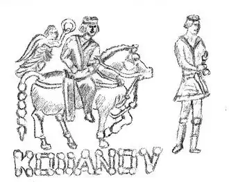 Légende grecque : ΤΥΡΑΝΝΟΥΟΤΟΣ ΗΛΟΥ - ΣΑΝΑΒ - ΚΟϷϷΑΝΟΥ, « Le tyran Héraios, Sanav, des Kouchans ».