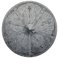 Durant le haut Moyen Âge, les Francs et les Vikings utilisèrent plutôt des boucliers ronds. Ils étaient souvent recouverts de cuir pour améliorer la rigidité (Fig. 8).