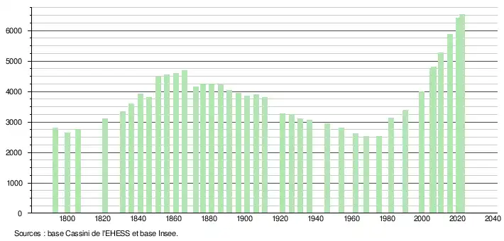 L'évolution du nombre d'habitants est connue à travers les recensements de la population effectués dans la commune depuis 1793. Pour les communes de moins de 10 000 habitants, une enquête de recensement portant sur toute la population est réalisée tous les cinq ans, les populations de référence des années intermédiaires étant quant à elles estimées par interpolation ou extrapolation[39]. Pour la commune, le premier recensement exhaustif entrant dans le cadre du nouveau dispositif a été réalisé en 2005[40].