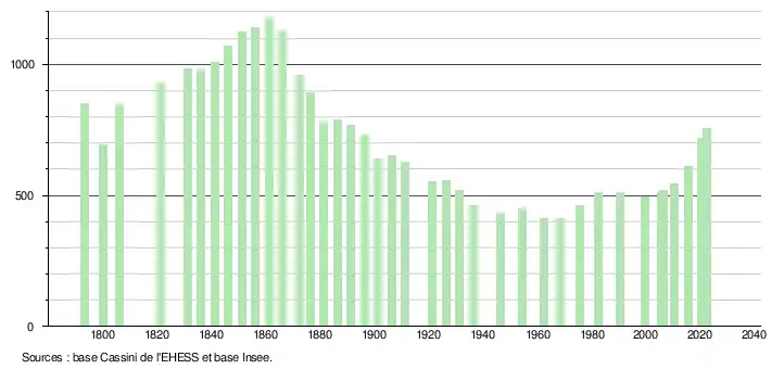 L'évolution du nombre d'habitants est connue à travers les recensements de la population effectués dans la commune depuis 1793. Pour les communes de moins de 10 000 habitants, une enquête de recensement portant sur toute la population est réalisée tous les cinq ans, les populations de référence des années intermédiaires étant quant à elles estimées par interpolation ou extrapolation[24]. Pour la commune, le premier recensement exhaustif entrant dans le cadre du nouveau dispositif a été réalisé en 2005[25].