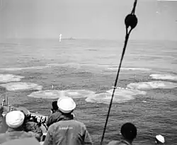 Les projectiles du Hérisson forment un cercle encadrant la position de la cible (U-853, qui ne survivra pas à ce tir).