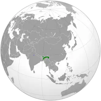 Cet oiseau vit au Bhoutan, du nord-est de l'Inde aux collines du Bangladesh, au nord du Myanmar et, historiquement au moins, dans le centre et l'ouest du Myanmar.