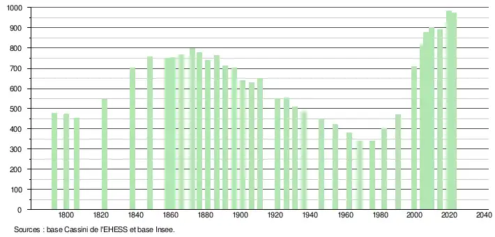 L'évolution du nombre d'habitants est connue à travers les recensements de la population effectués dans la commune depuis 1793. Pour les communes de moins de 10 000 habitants, une enquête de recensement portant sur toute la population est réalisée tous les cinq ans, les populations de référence des années intermédiaires étant quant à elles estimées par interpolation ou extrapolation[12]. Pour la commune, le premier recensement exhaustif entrant dans le cadre du nouveau dispositif a été réalisé en 2004[13].