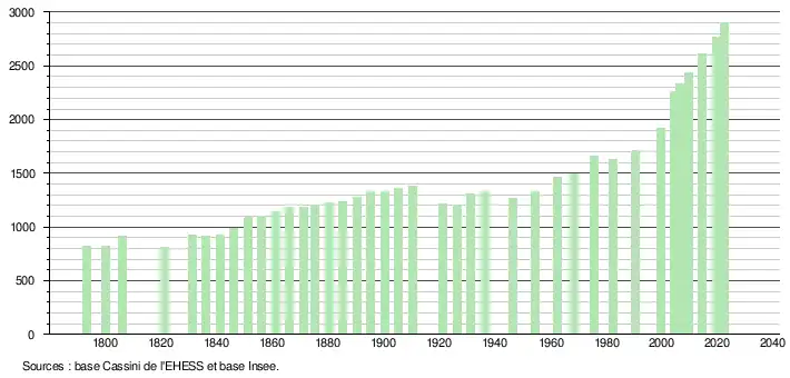 L'évolution du nombre d'habitants est connue à travers les recensements de la population effectués dans la commune depuis 1793. Pour les communes de moins de 10 000 habitants, une enquête de recensement portant sur toute la population est réalisée tous les cinq ans, les populations de référence des années intermédiaires étant quant à elles estimées par interpolation ou extrapolation[35]. Pour la commune, le premier recensement exhaustif entrant dans le cadre du nouveau dispositif a été réalisé en 2004[36].