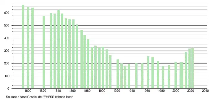 L'évolution du nombre d'habitants est connue à travers les recensements de la population effectués dans la commune depuis 1793. Pour les communes de moins de 10 000 habitants, une enquête de recensement portant sur toute la population est réalisée tous les cinq ans, les populations de référence des années intermédiaires étant quant à elles estimées par interpolation ou extrapolation[25]. Pour la commune, le premier recensement exhaustif entrant dans le cadre du nouveau dispositif a été réalisé en 2008[26].