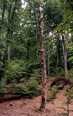Dans une hêtraie naturelle, le stock permanent de bois mort est significatif : une hêtraie sub-naturelle extensivement exploitée a été étudiée sur 8 ha en forêt de Serrahn, en Poméranie occidentale dans le nord-ouest de l'Allemagne ; On y trouvait en moyenne 94 m3/ha environ de bois mort, soit 14 % du volume total de tout le bois. On a aussi étudié durant 35 ans deux petites placettes permanentes d'observation protégées de l'exploitation (sur respectivement 0,36 et 0,25 hectare) ; sur ces 2 parcelles, environ 10 % des arbres sont morts à différents degrés de décomposition, et sur une large gamme de hauteurs ou diamètres, avec à la fois des arbres morts debout, ou non et couchés/déracinés[8]. fragmentés ou non... Le motif de répartition spatiale globale des arbres morts est de type aléatoire, hormis pour les arbres déracinés qui présentent une légère tendance à l’agrégation en îlots dans certains chablis[8]).