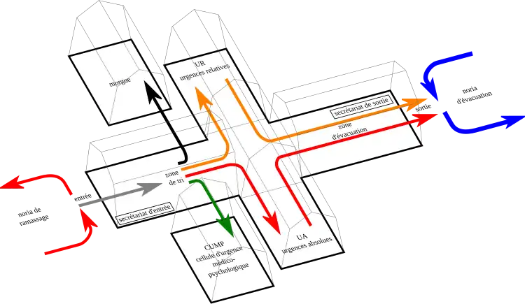 - une zone d'accueil et de tri, sous la responsabilité d'un médecin trieur ; les victimes sont réceptionnées et triées en fonction de la gravité de leurs blessures ;