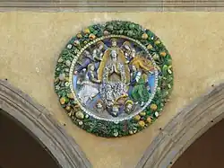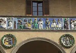 Sur la façade, au-dessus des arcs de la loggia, se trouve une frise en terre cuite aux couleurs vives et vernissée, tandis que des tondi de la même technique sont insérées dans les écoinçons des arcs.
