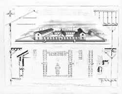 Le bâtiment à construire prend la forme d'un plan carré ouvert vers le large, avec les deux côtés parallèles, au nord et au sud, constitués par des corps de logis symétriques longs de 45 mètres, espacés de 45 m, avec un seul étage sous une toiture à deux pans. Un bâtiment, uniquement en rez-de-chaussée, ferme le côté est. La cour créée au centre est ouverte vers l'ouest et la mer, avec une chapelle située à égale distance des deux édifices latéraux. À l'Est, des petits édifices sont placés en symétrie au nord et au sud des corps de logis[9],[8].