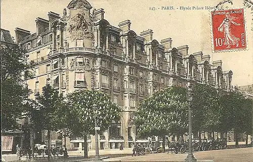 Terminus parisien de la Compagnie des wagons-lits, l'Élysée Palace est inauguré le , en présence de l'élite mondaine. Il est meublé par sir John Blundell Maple et renouvelle la conception du grand hôtel par une architecture intérieure nouvelle organisée autour d'un immense hall qui recentre la vie mondaine vers l'intérieur de l'hôtel où de nombreux services sont à disposition de la clientèle : studio photographique, agence théâtrale, boutiques de luxe et même une galerie de tableaux[2].