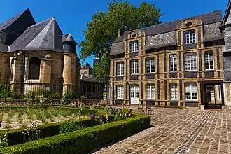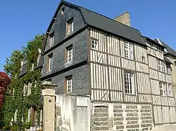 Les différents matériaux de la façade principale sont de l’ardoise, en bardage et en couverture, du silex noir, de la brique et de la pierre de Caen.