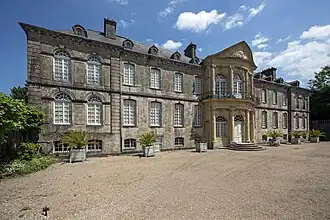 Haut d'un étage sur rez-de-chaussée surélevé, l'imposante façade longue de cinquante mètre[11], s'éclaire par deux niveaux de baies. L'avant-corps, péristyle de style Régence, en saillie et en léger arrondi, précédé d'un perron, arbore à l'étage un balcon en fer forgé surmonté d'un fronton incurvé dont le tympan est rehaussé d'écussons sculptés. Les armoiries, martelées à la Révolution figurent les armes de Pierre-Guillaume Jallot de Beaumont : d'azur au chevron d'argent chargé de trois merlettes de sable et accompagné de trois trèfles d'or, 2 et 1 et de son épouse Anne-Françoise de Cairon de La Pallu : de gueules à trois coquilles d'argent[12]. Ses baies en plein cintre avec sculptures, sont encadrées de colonnes doriques et ioniques superposées. Les combles s'éclairent par des œils-de-bœuf.