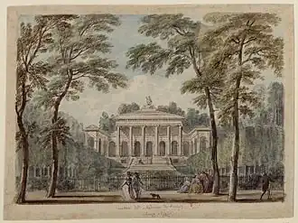 En résulte un effet d'isolation majestueuse du principal corps de logis, renforcé par un portique de six colonnes d'ordre ionique surmonté d'une toiture en gradins sommée d'un groupe sculpté par François-Joseph Duret, sculpteur souvent associé à Boullée, représentant une figure de Flore accompagnée de deux enfants tenant des guirlandes de fleurs[19].