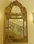 L'étage supérieur comporte un fronton triangulaire sur toute la largeur de l'avant-corps, qui s'appuie sur des pilastres aux chapiteaux ornés de feuilles d'eau de chaque côté d'une petite fenêtre, ainsi que sur le chaînage de refend à ses extrémités.