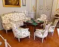 Pièce ornée de gypseries comme les autres, elle est dans un ton bleu clair. Les quatre vertus cardinales, les putti, les dragons, Tempérance, Prudence, Force et Justice y sont mis en scène. On y trouve une console galbée en chêne sculpté et ajouré avec son plateau de marbre brèche rouge du Languedoc, un tableau anonyme représentant Jupiter et Léda, un Pan et Syrinx du XVIIIe siècle, un Portrait de Marie-Antoinette lisant et un Portrait de la marquise de Pompadour, une paire d'appliques en bronze redoré de style Régence.