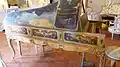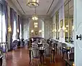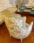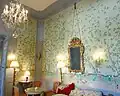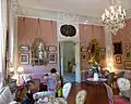 Cette pièce est considérée comme étant la plus belle de la demeure, son riche décor de gypseries dorées , écrin de clavecin de style Louis XV, avec une table de jeu et un jeu de bingo du XVIIIe siècle, des fauteuils à motifs floraux, une harpe peinte, une paire d'appliques Louis XV en bronze doré, des représentations de putti et de scène mythologiques.