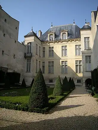 L'élégance de cette architecture est due à la perfection du rythme des ouvertures : demi-croisée - croisée - croisée - demi-croisée. Subtilement, du côté de la cour, tout concourt a créer un effet pyramidant : ainsi les deux lucarnes percées dans le comble sont réunies sous un même fronton ; du côté du jardin, seules les croisées pleines sont surmontées de lucarnes. Cette pureté déjà classique n'est alourdie par aucun décor sculpté : à la base du toit, les consoles sont laissées nues, de simples moulures soulignent l'arrondi des lucarnes et les rampants des frontons. Si le corps de logis principal semble intact, il n'en est pas de même des pavillons : l'analyse de leur construction fait penser à un ajout ou une surélévation. Les transformations apportées aux XVIIe et XVIIIe siècles ne permettent plus de situer avec certitude l'emplacement de l'entrée principale de l'hôtel. Il est probable qu'une porte percée au rez-de-chaussée du pavillon nord de la cour donnait accès à l'escalier desservant l'appartement, les communs et le jardin. L'escalier actuel, du type " à vuide " et pourvu d'une rampe en fer forgé date de la fin du XVIIe siècle, comme le montrent ses caractéristiques et les comparaisons avec d'autres escaliers dans le Marais. Sa modification entraîna celle du pavillon nord et, par souci de symétrie, une transformation du pavillon sud. Les ailes furent probablement surélevées en même temps, comme l'ont suggéré, lors de la restauration de l'hôtel, les traces d'une ancienne toiture de l'aile nord[4].