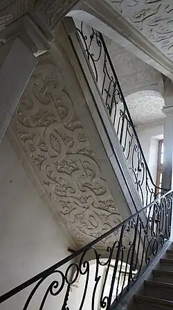 Cet escalier est très moderne pour son époque : il est construit en pierre, sans mur d'échiffre, ses volées appuyées sur des arcades qui retombent sur deux fins piliers de section carré et des culs-de-lampe. Les plafonds des volées, des repos et des paliers sont décorés d'entrelacs de bandes, de volutes, de rosaces et de feuillages sculptés. Les arcs diaphragmes et les culs-de-lampe sont eux aussi richement sculptés. L'escalier comporte un garde-corps en fer forgé au dessin sobre et élégant.