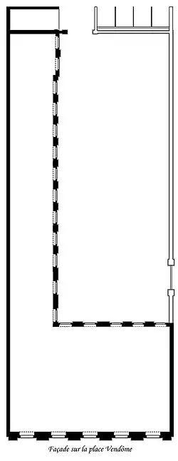 La parcelle de l'hôtel, qui mesure un peu plus de la moitié des 1 683 m2 de la parcelle d'origine (qui englobait les 7 et 9 place Vendôme), est constituée de trois zones. Sur la place s'élève un corps de logis principal en double profondeur. Il est bordé, à l'arrière, par une vaste cour, et est complété par une aile en retour d'angle de treize croisées longeant le côté gauche de la parcelle jusqu'à son extrémité et terminée par une terrasse.