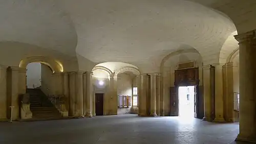 Au rez-de-chaussée se trouve un vestibule comportant une voûte très surbaissée, formée de deux berceaux à angle droit, retombant en culs-de-four et raccordés aux parois par des lunettes. Malgré la portée qui atteint 15 m, la flèche de la voûte est très faible. Le visiteur est là devant le chef-d'œuvre absolu de la stéréotomie française, qui réunit avec une virtuosité inégalée toutes les caractéristiques de cet art - surbaissement, jeu d'appareil, nudité d'intrados [5].