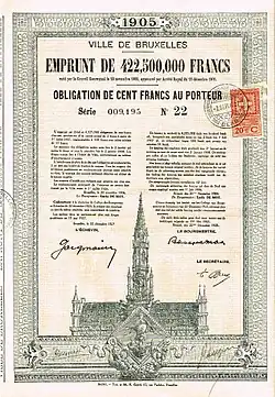 - ↑ Plaque commémorative apposée sur la façade de l'hôtel de ville située rue Charles Buls